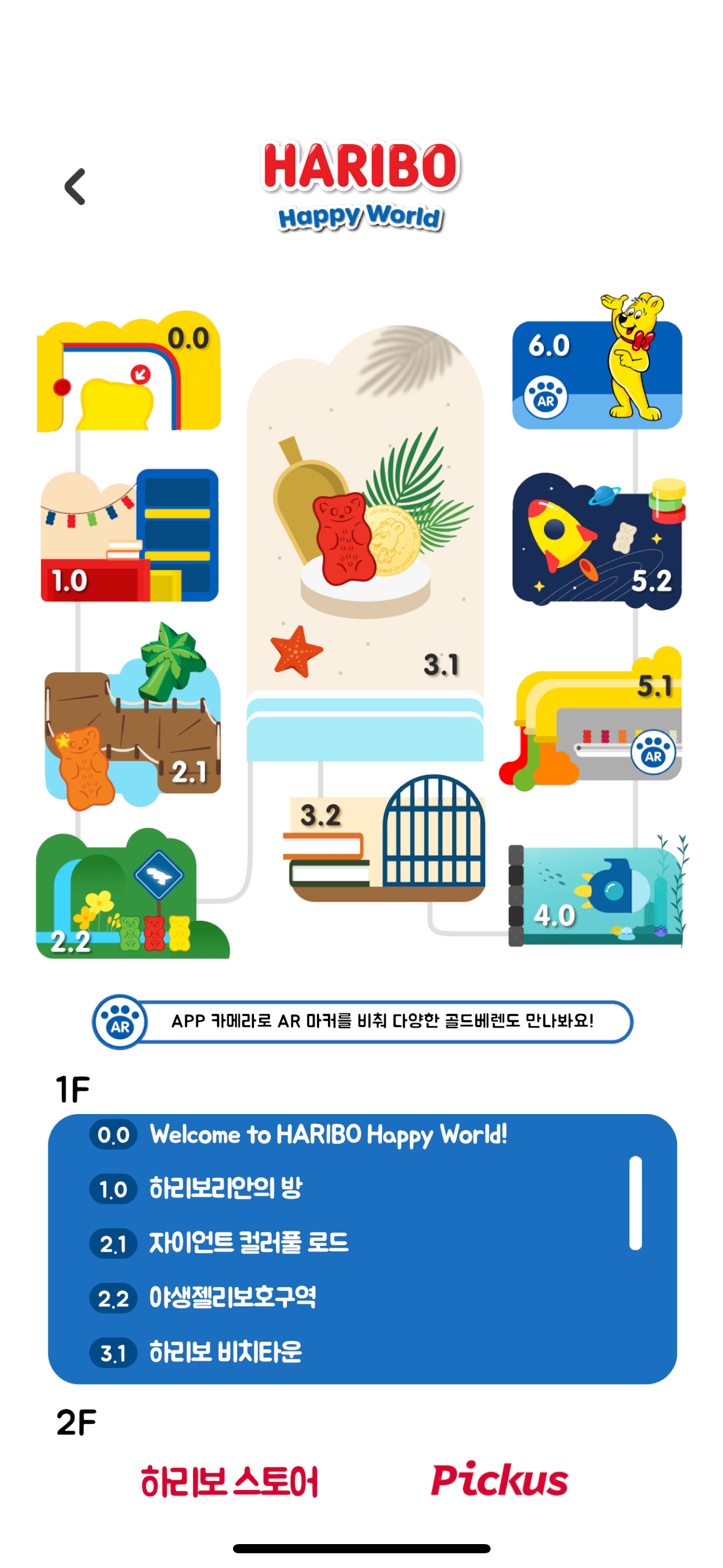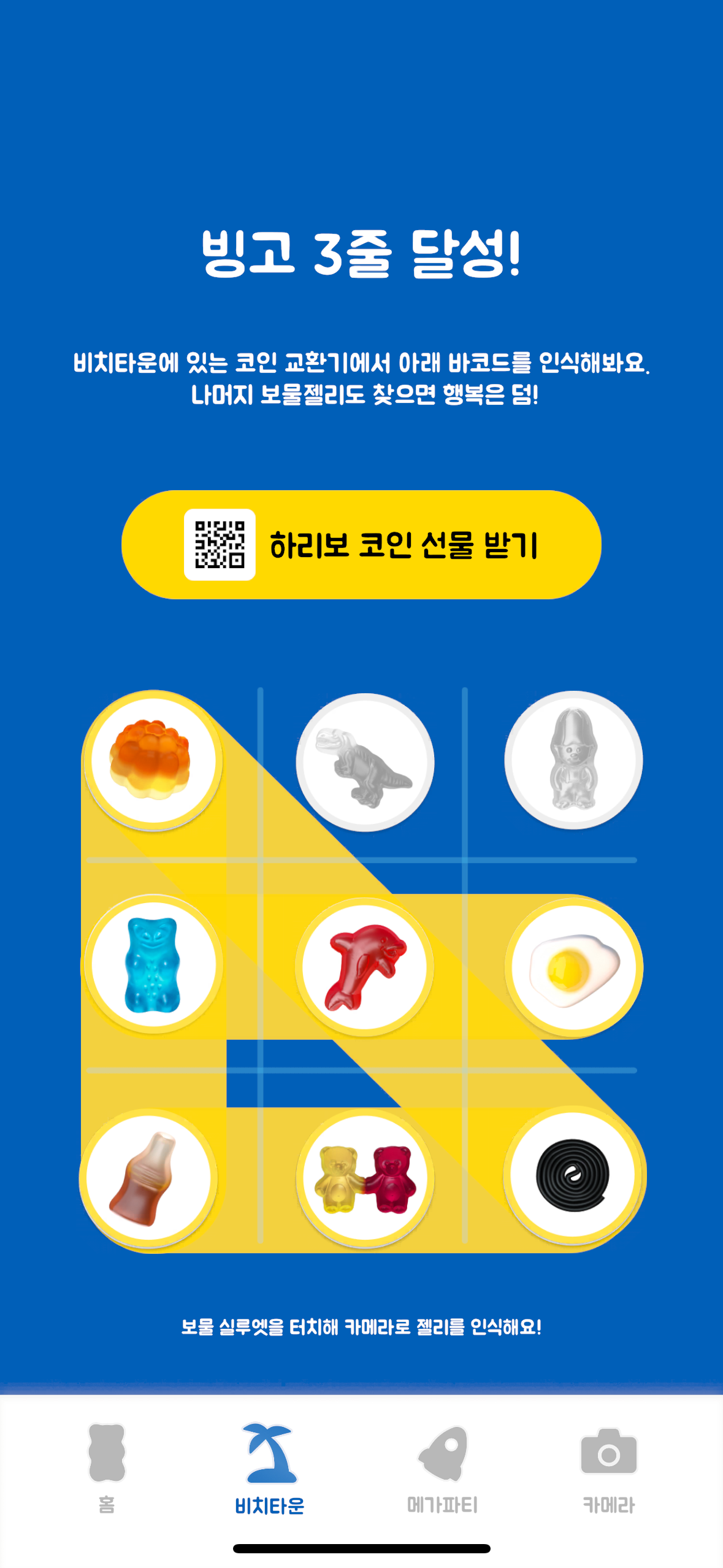 입장 후 안내에 따라 하리보 앱을 설치하면 빙고 게임에 참여할 수 있어요. 공간 곳곳을 다니면서 빙고판을 채우는 방식이라 아이들이 심심할 틈이 없어요.